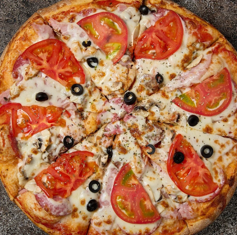 окорок, сервелат, ветчина, грибы, куриная грудка, помидор, маслины, моцарелла, соус томатный, орегано